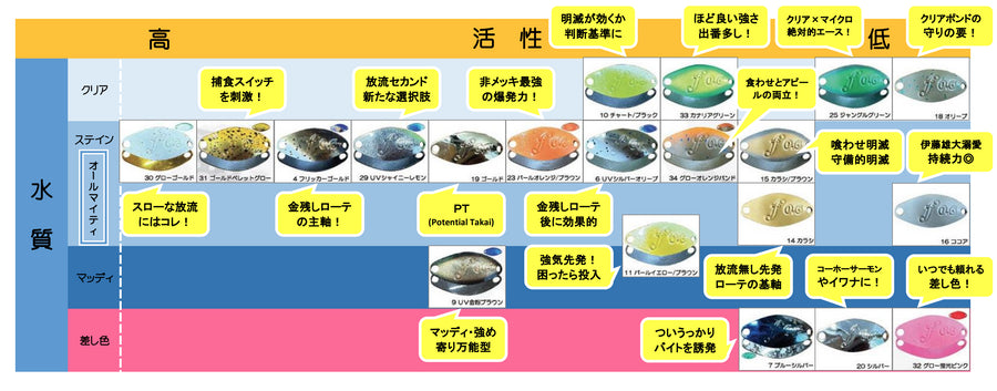 フォルテ0.6gの最大の特徴であるスロー巻きとの相性を考慮し、カラーラインナップを決定。放流フェーズの終わり際~低活性まで対応するべく、中間的なパワー感を持つカラーを多彩に取り揃えました。